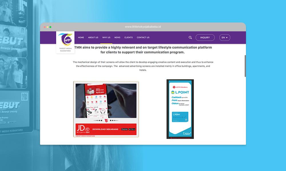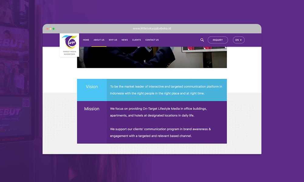 Tim web developer Jakarta kami menyiapkan website company profile custom untuk Target Media Nusantara agar dapat meningkatkan brand awareness, kredibilitas serta menjadi media informasi yang dapat diakses dimana saja dan kapan saja. Harapan kami dengan adanya website custom untuk TMN ini, setiap orang yang tertarik untuk bekerjasama dengan TMN akan mendapatkan informasi lebih mudah melalui website ini. Sebagai salah satu jasa buat website Jakarta kami selalu memberikan yang terbaik untuk semua kebutuhan klien kami termasuk Target Media Nusantara. Ditambah dengan layanan jasa seo Jakarta yang kami berikan, ini akan mempermudah website tersebut untuk bisa muncul pada ranking teratas di hasil percarian Google.